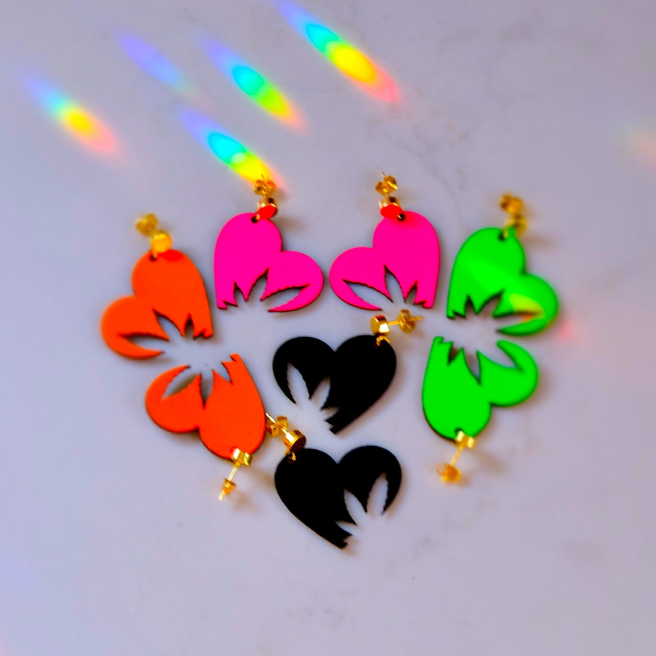 Each piece is a thoughtfully shaped heart with *plant* cutouts along the side. When put together, these earrings form a fully developed leaf. Share a single earring with a friend, or keep the whole pair for yourself to subtly show off your love for the c*nn*bis plant ;)