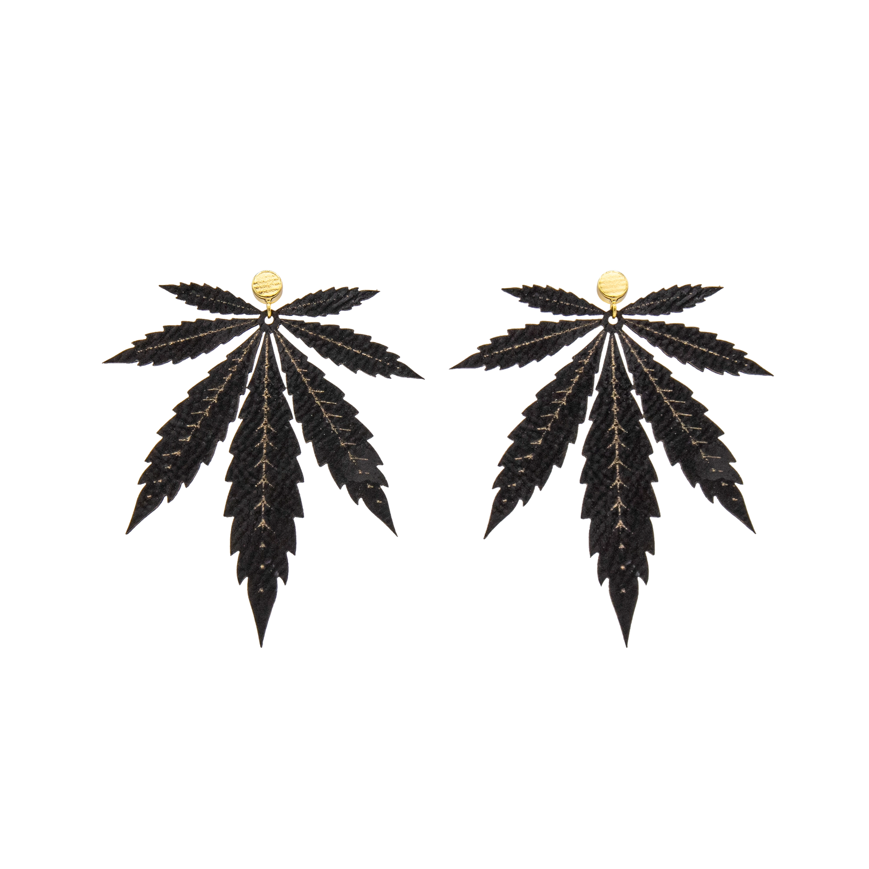 Sustainable style meets cannabis culture with our large black leatherette cannabis leaf earrings. Bold, lightweight, and likely to compliment 90% of your wardrobe.